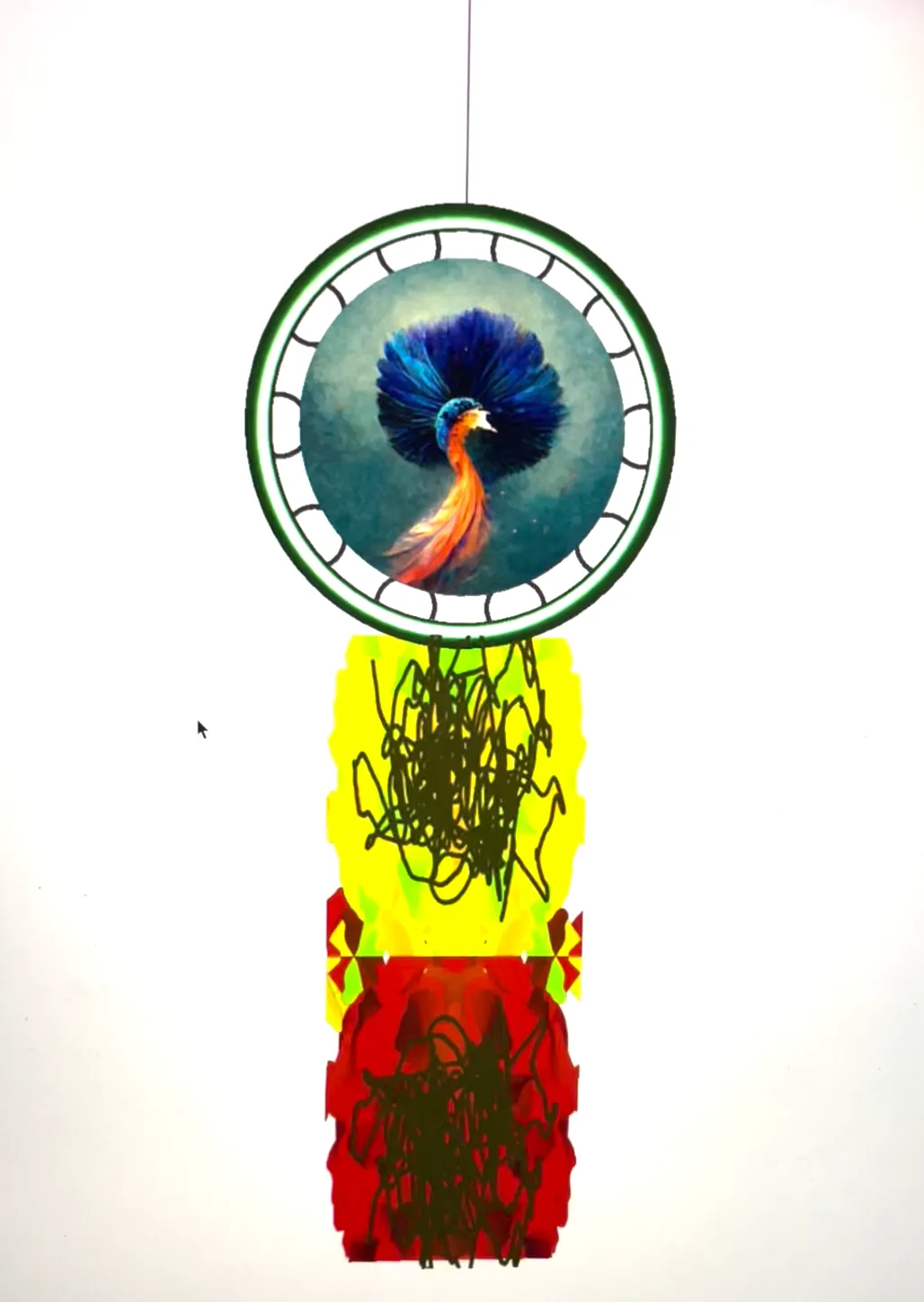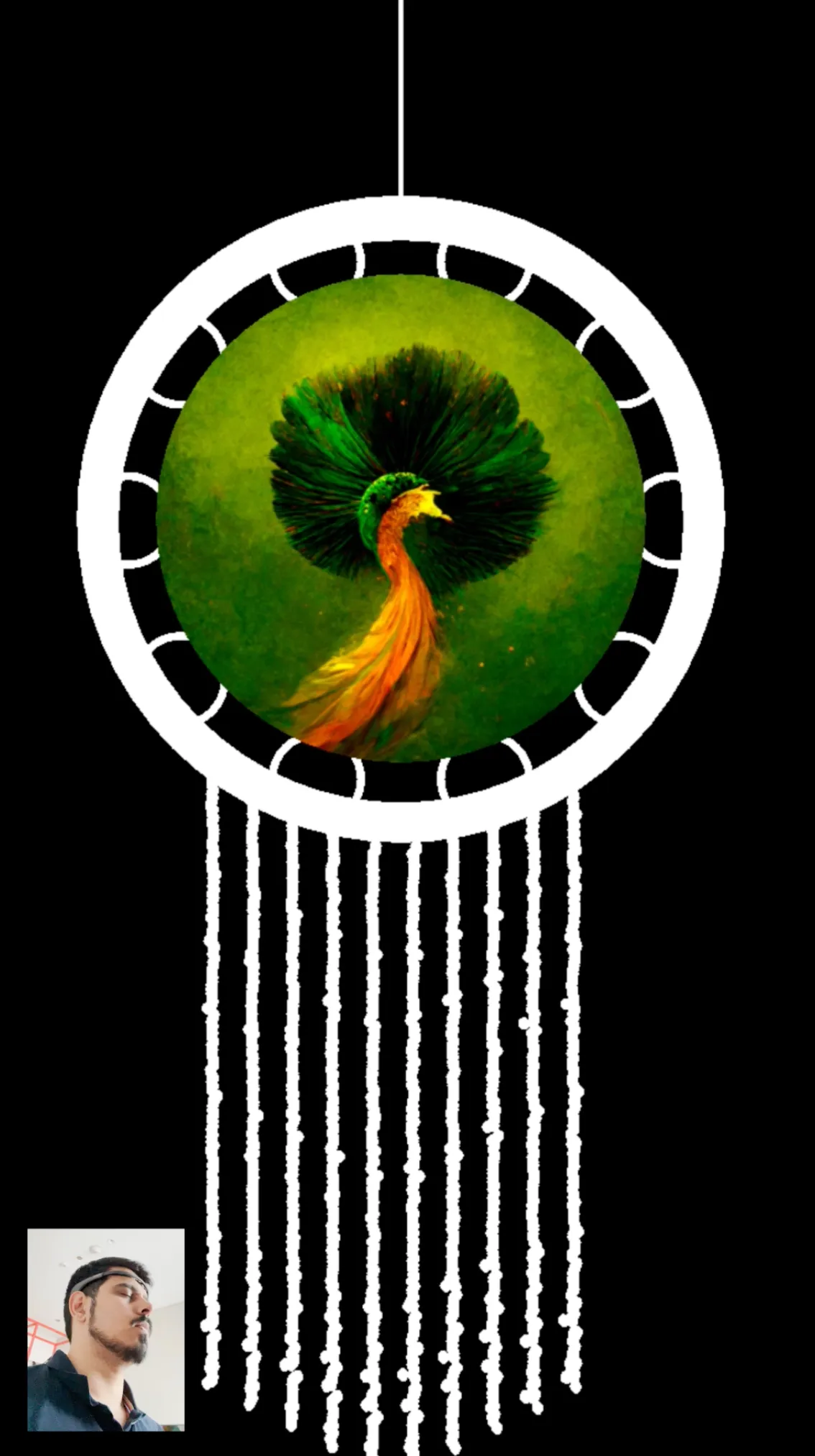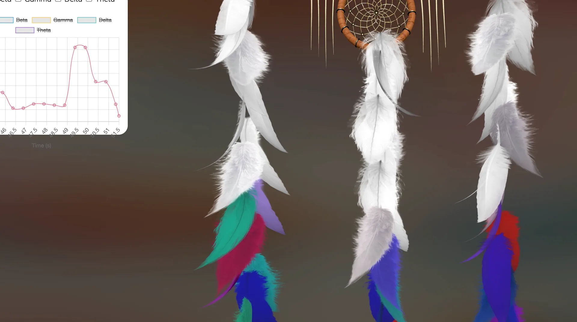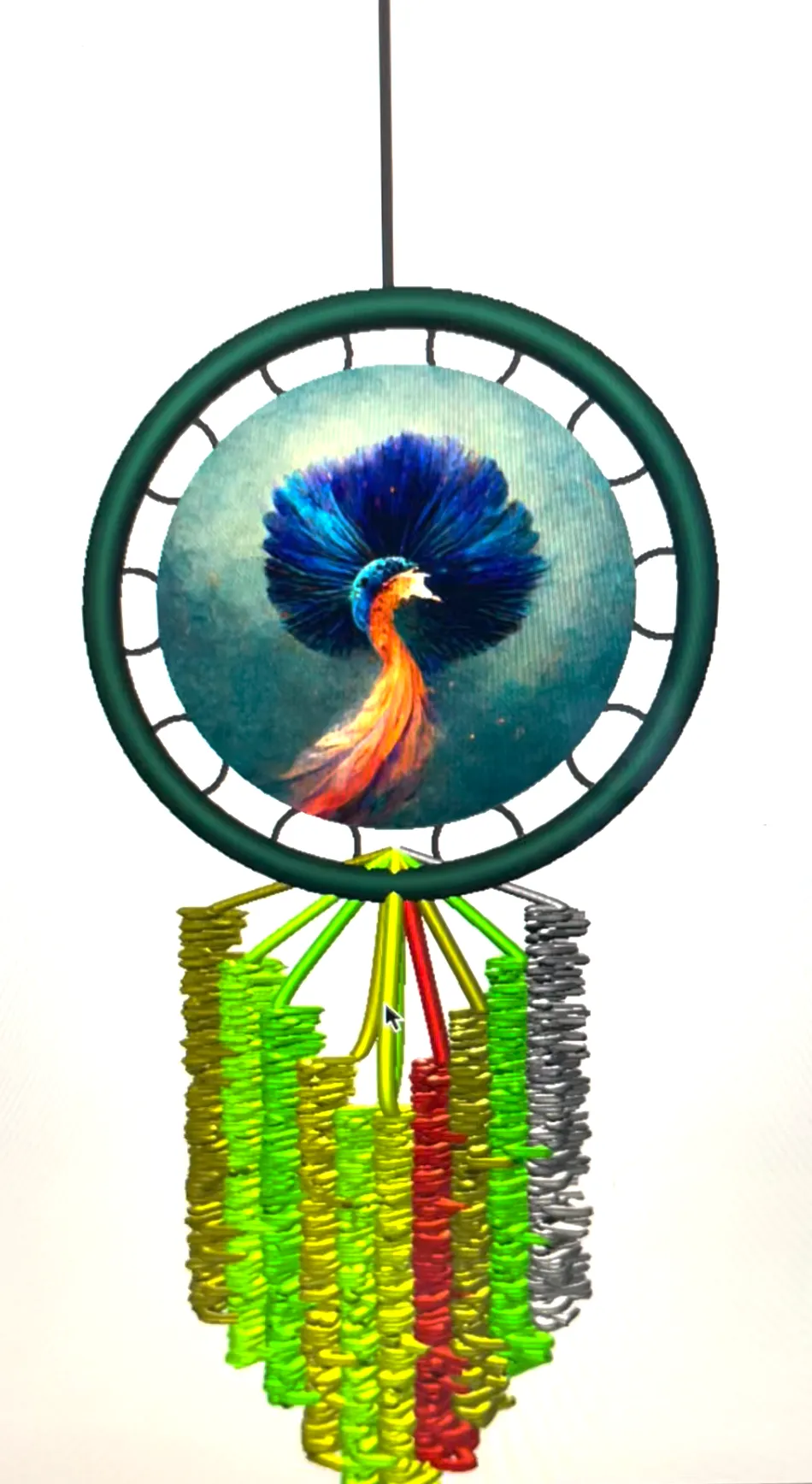Dreamcatcher 3 was created after a study on synchronicities with 7 people. During the process of creation, I entered a hypnagogic state, while wearing an EEG headband. In the state, I first asked my subconscious to show connections between people (intent image). The image I saw was whispered out which was then converted to text prompts using a speech-to-text AI model and an LLM. This prompt was then used to generate a digital image using an image generation AI model. This intent image was placed at the top of the sculpture generatively. This intent image was placed at the top of the sculpture generatively. Post this, I mentioned the name of each person and fetched an image related to each of them from my subconscious. Each image I saw was generatively attached to the feathers of the dreamcatcher. The color-saturation of the feathers corresponded to how calm/active I was during the session. Post the session, each image was shared with each participant and were asked to narrate any real-world connections they had with the image. All the connections they narrated have been recorded with the artwork. These narrations had elements of synchronicities, nostalgia and healing in them.