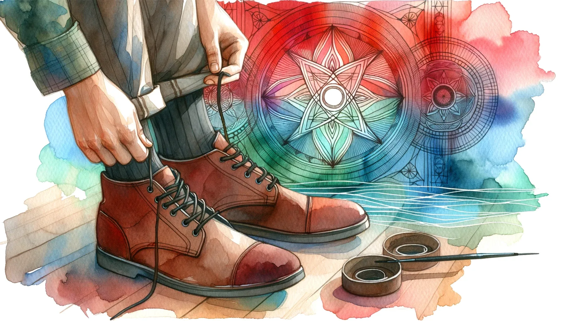 Prompt: I see brown shoes with lace open and on both sides, a man with black socks and a gray pant is wearing the shoes