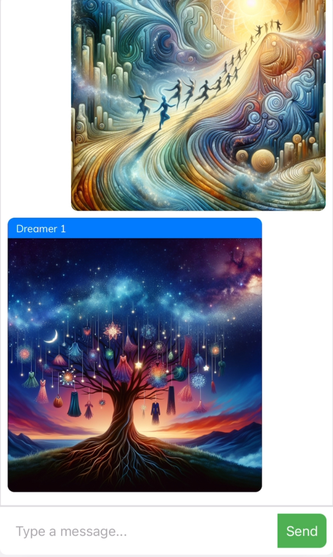 At its core, the process of the first phase of this project is elegantly simple. It is a chatbot interface between two people, allowing them to communicate solely through images. Powered by an OpenAI DALL-E backend, the prompts used to generate these images are carefully modified such that the resulting images are rich in symbols, metaphors, and poetry, drawing inspiration from Jungian and other dream philosophies. This leads to an image-only conversation between two people in the language of dreams.